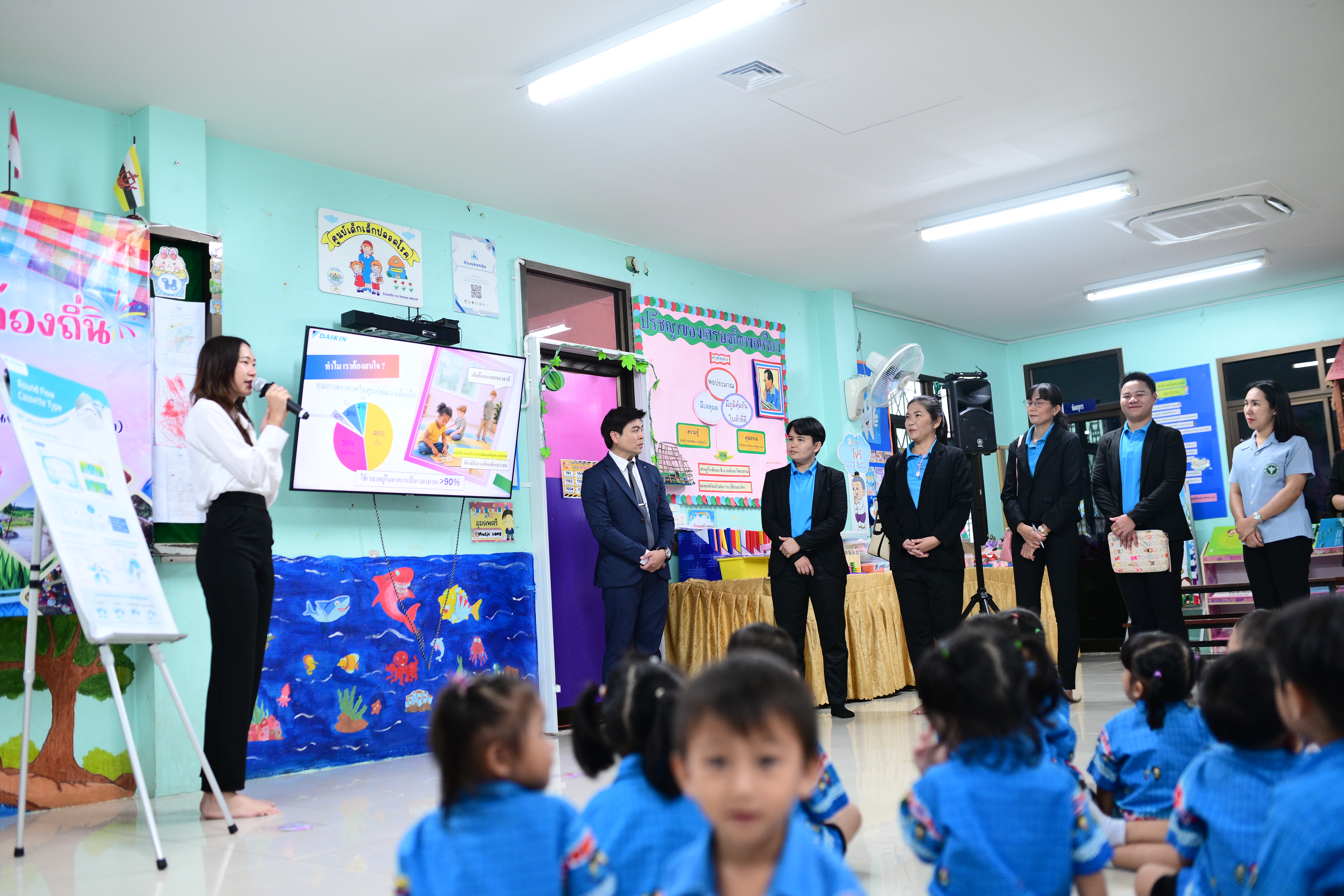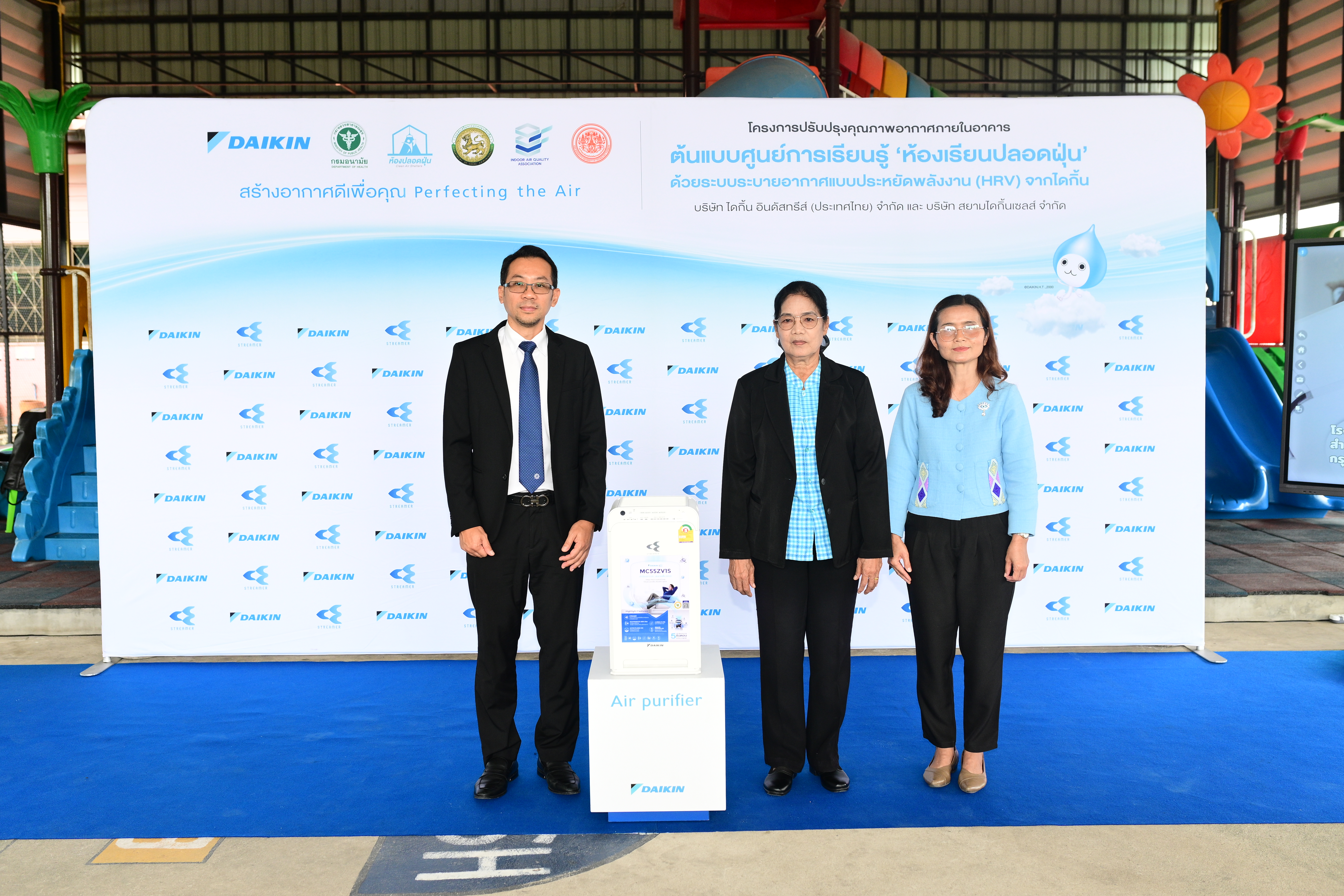 ในการส่งมอบครั้งนี้ ไดกิ้นได้ติดตั้งระบบปรับอากาศและระบบระบายอากาศที่มีประสิทธิภาพสูง สามารถช่วยลดปริมาณฝุ่นละอองขนาดเล็ก PM2.5 และก๊าซคาร์บอนไดออกไซด์ที่เกินค่ามาตรฐาน พร้อมทั้งเสริมด้วยชุดเติมอากาศบริสุทธิ์ (Outdoor Air Processing Unit: OAPU) และเซ็นเซอร์ตรวจวัดคุณภาพอากาศ เพื่อให้ครูและผู้ดูแลสามารถเฝ้าระวังได้ทันทีผ่านระบบแบบเรียลไทม์ นอกจากนี้ ยังได้มอบเครื่องฟอกอากาศ Daikin จำนวน 2 เครื่อง เพื่อใช้งานในห้องเรียนจริง ถือเป็นการยกระดับคุณภาพอากาศในศูนย์พัฒนาเด็กเล็กแห่งนี้อย่างครบวงจร