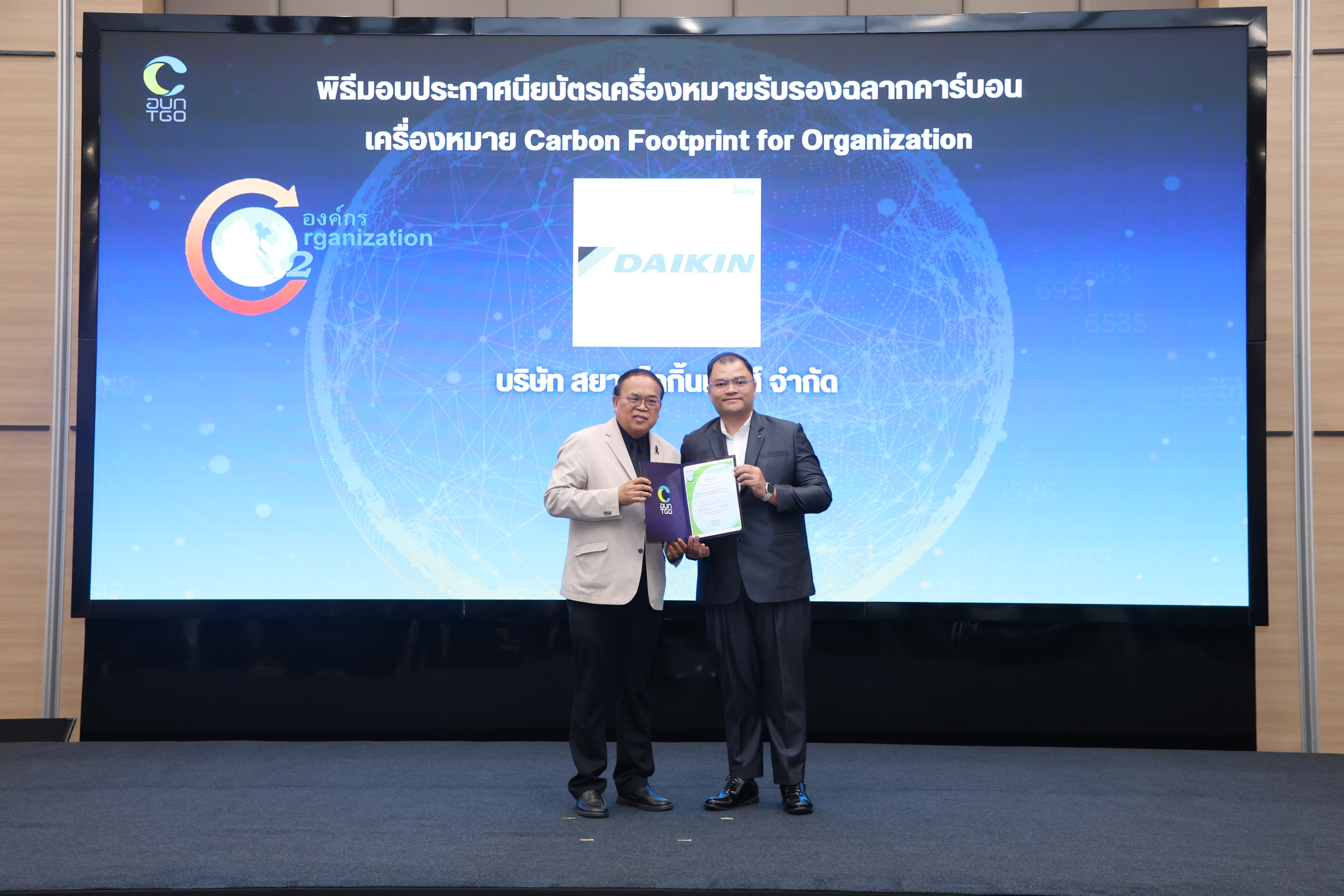 สำหรับการรับรองในครั้งนี้ ไดกิ้นได้รับเครื่องหมายรับรองฉลากคาร์บอนจาก อบก. ครอบคลุมทั้งระดับผลิตภัณฑ์และระดับองค์กร ได้แก่ เครื่องหมายคาร์บอนฟุตพริ้นท์ของผลิตภัณฑ์ (Carbon Footprint of Product : CFP) โดยมี นายนัฐพงค์ หันแจ้ด ผู้จัดการทั่วไป ฝ่ายธุรการและบริหารงาน บริษัท ไดกิ้น อินดัสทรีส์ (ประเทศไทย) จำกัด เป็นผู้แทนรับมอบ และ เครื่องหมายคาร์บอนฟุตพริ้นท์ขององค์กร (Carbon Footprint for Organization : CFO) โดยมี นายอรรถพร อุทธา ผู้จัดการฝ่ายบริการและการจัดจำหน่ายอะไหล่ บริษัท สยามไดกิ้นเซลส์ จำกัด เป็นผู้แทนรับมอบ