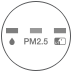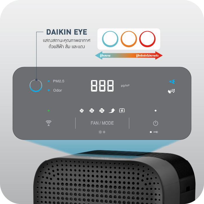 แสดงสถานะคุณภาพอากาศผ่านไดกึ้นอาย ด้วยลูกเล่นวงแหวนและการแสดงสีที่หลากหลาย แสดงตัวเลขความเข้มข้น PM2.5 (หน่วยไมโครกรัมต่อตารางเมตร) แสดงผลคุณภาพอากาศด้วยสีฟ้า(ดี) สีส้ม(กลาง) และสีแดง(ไม่ดี)