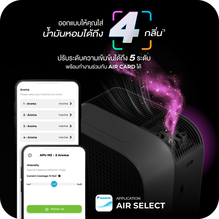 ออกแบบมาให้รองรับน้ำมันหอมระเหยได้ถึง 4 กลิ่น เปลี่ยนมู้ดได้ทันทีแค่เข้าโหมดอโรมา และยังสามารถทำงานร่วมกับ Air Card กำหนดกลิ่นที่ใช่สำหรับแต่ละกิจกรรมได้ด้วยตัวคุณเอง (แนะนำให้ใช้น้ำมันหอมระเหย 100% (essential oil 100%))