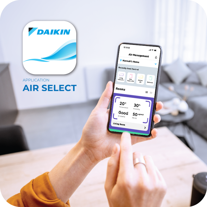 สะดวกสบาย เข้าถึงการใช้งานเครื่องปรับอากาศได้ด้วยแอป Daikin Air Select สั่งการจากนอกบ้านได้ทุกที่ทุกเวลาด้วยการเชื่อมต่ออินเทอร์เน็ต หรือสั่งการเครื่องได้โดยตรงแม้อินเทอร์เน็ตไม่พร้อมใช้งาน อีกทั้งยังสามารถปรับเปลี่ยนการทำงานรวมถึงตั้งเวลาเปิดปิดได้ตามต้องการ ช่วยลดความกังวลใจ และมีสมาธิกับเรื่องสำคัญมากขึ้น