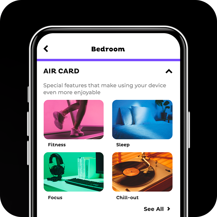 สร้างบรรยากาศที่เหมาะสมกับกิจกรรมต่าง ๆ ในชีวิตประจำวันของคุณ โดยประสานการทำงานระหว่างเครื่องปรับอากาศและเครื่องฟอกอากาศ - Fitness AIR CARD สำหรับการออกกำลังกาย - Sleep AIR CARD สำหรับนอนหลับพักผ่อน - Focus AIR CARD สำหรับกิจกรรมที่ต้องการสมาธิ - Chill Out AIR CARD สำหรับช่วงเวลาชิล ๆ และสามารถออกแบบ AIR CARD ของคุณได้เองด้วย Customize AIR CARD